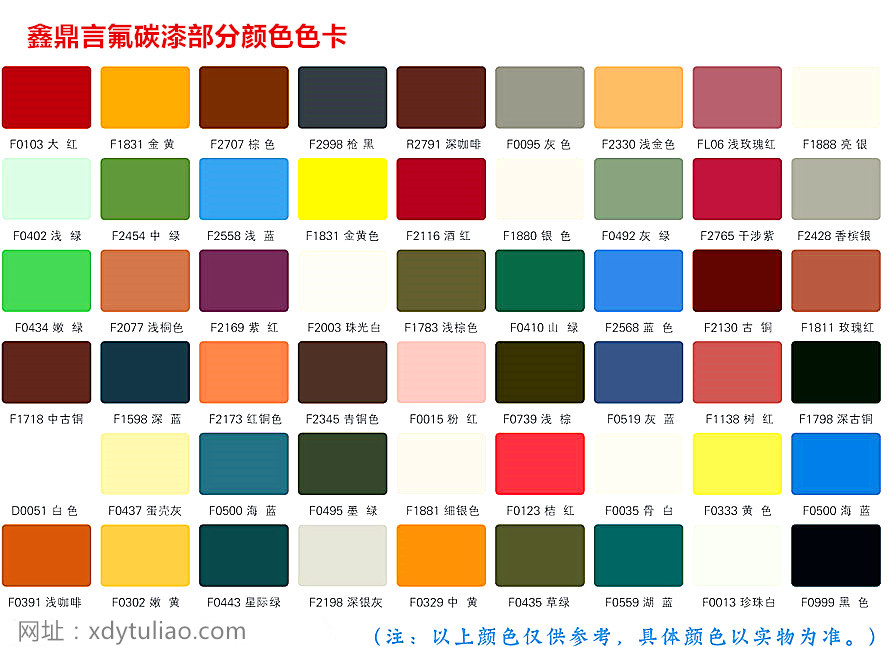 氟碳漆顏色有很多種,光澤上分為亮光,平光,啞光,無光;常用的金屬色氟碳漆顏色有:金色、銀白色、銀灰色,香檳銀、藍銀等,常用的氟碳漆實色有:大紅色、灰色、白色、中綠色、中黃色、藍色、紫色、桔紅色、黑色、酒紅色、棕色等。鑫鼎言客戶可以選擇氟碳漆色卡有:歐標RAL色卡(RAL國際色卡、勞爾色卡)、鑫鼎言氟碳漆色卡、國標GSB漆膜顏色標準色卡(GSB05-1426-2001)、金屬漆色卡。客戶可以根據底材