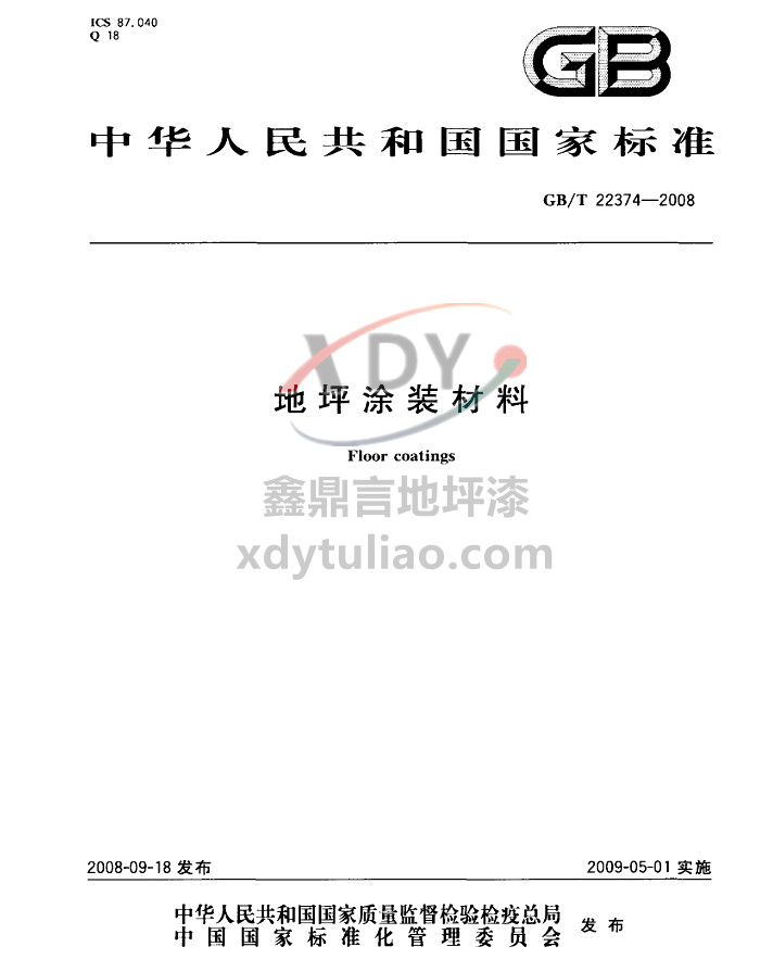 GB/T 22374-2008地坪涂裝材料國家標準 中華人民共和國國家標準 GB/T 22374-2008 地坪涂裝材料Floor coatings 2008-09-18發行 2009-05-01實施 中華人民共和國國家質量監督檢驗檢疫總局 中國國家標準化管理委員會 發布 本標準規定了合成樹脂基地坪涂裝材料的術語和定義、產品分類、有害物質限量及物理性能要求、試驗方法、檢驗規則、標志、包裝、運輸與貯