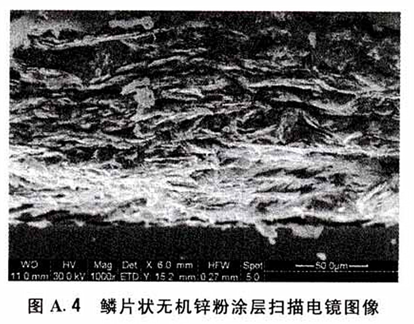 圖A.4  鱗片狀無(wú)機(jī)鋅粉涂層掃描電鏡圖像