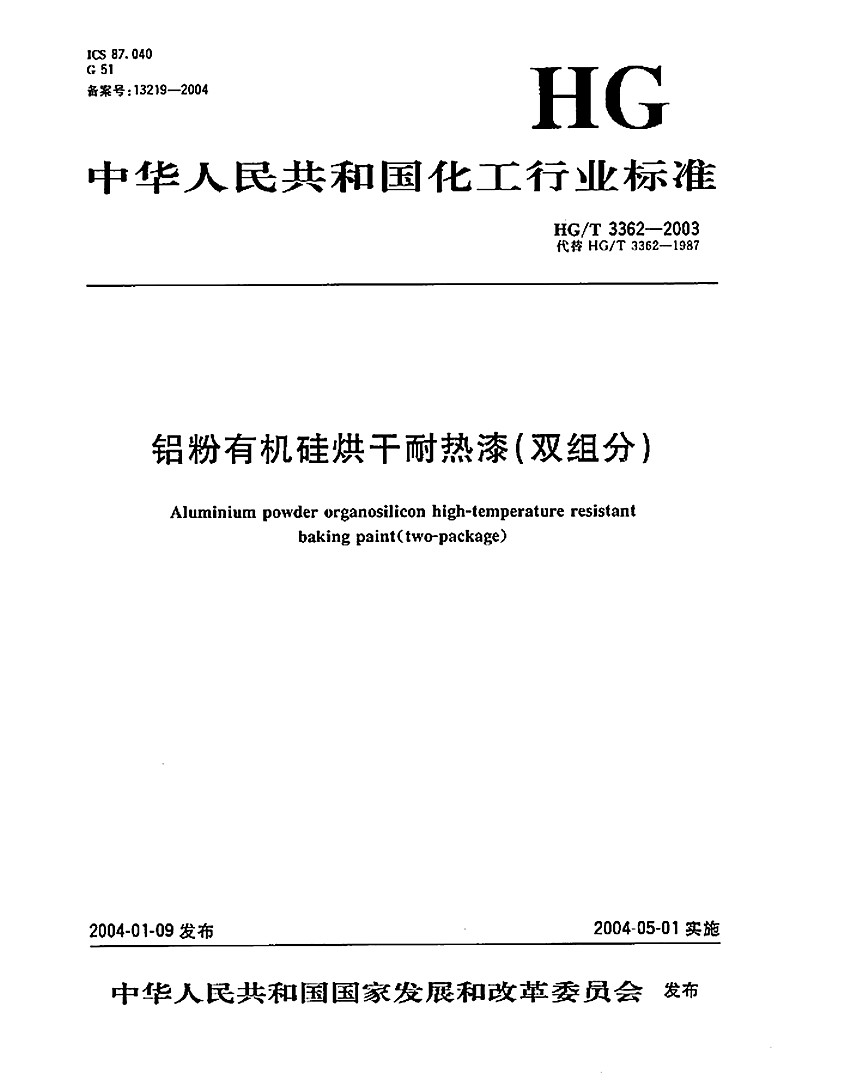 有機硅耐高溫漆標準HG/T3362-2003 ICS 87. 040 G 51 備案號:13219-2004 HG 中華人民共和國化工行業標準 HG/T 3362-2003代替 HG/T 3362-1987 鋁粉有機硅烘干耐熱漆(雙組分) Aluminium powder organosilicon high-temperature resistant baking paint(two-